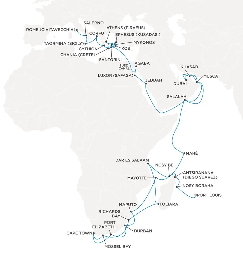 A Grand Voyage of discovery awaits on the special Indian Ocean Odyssey journey that begins on the heavenly island of Mauritius, sailing to the Southeast coast of Africa, north through Arabia and into the Mediterranean.
