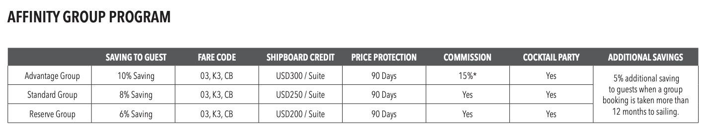 Travel partners will enjoy the benefits of the Affinity Group Program when they book 6 suites or more for a group travelling on the same voyage, enabling them to offer unparalleled value upfront.