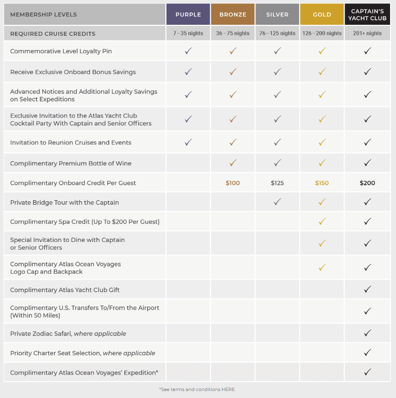 Guests are automatically enrolled in Atlas Yacht Club when they make their first cruise booking. Using their loyalty number, guests can register at MyAtlas to indicate their personal preferences such as mini-bar beverages, preferred bed configuration, parka and rubber boot sizes, and any special requests. As a member of the club, loyalty guests will enjoy benefits, special savings on select voyages, private cocktail parties with the captain and senior officers, and onboard credits up to US$200 per guest.