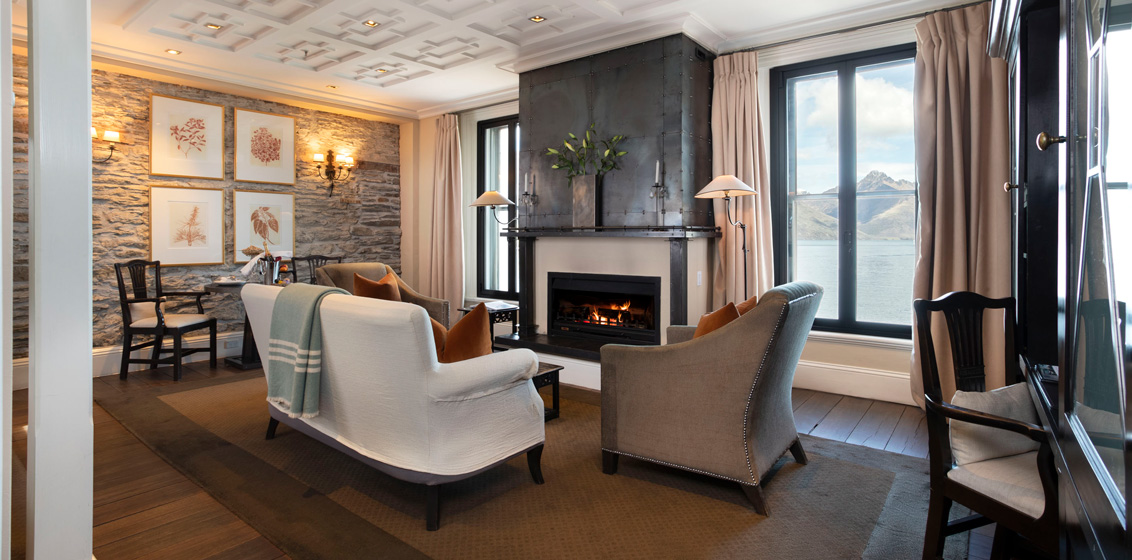 The famous Queenstown address first opened in 1861 and is known as the country’s most awarded private hotel offering a collection of highly curated suites, penthouse private apartments and three-bedroom residence, all on the banks of Lake Wakatipu.As part of the refurbishment, the collection of four luxury private apartments underwent a floor-to-ceiling makeover with each repainted and fitted with new New Zealand wool carpets, luxury bedding and an updated lounge area. The new floor and wall design gives prominence to soft cream and neutral tones, drawing attention to the darker living room furniture and stone firebox. The dynamic follows through the sunroom, where the large window wooden frame contrasts against the dark floor and grey stone walls.