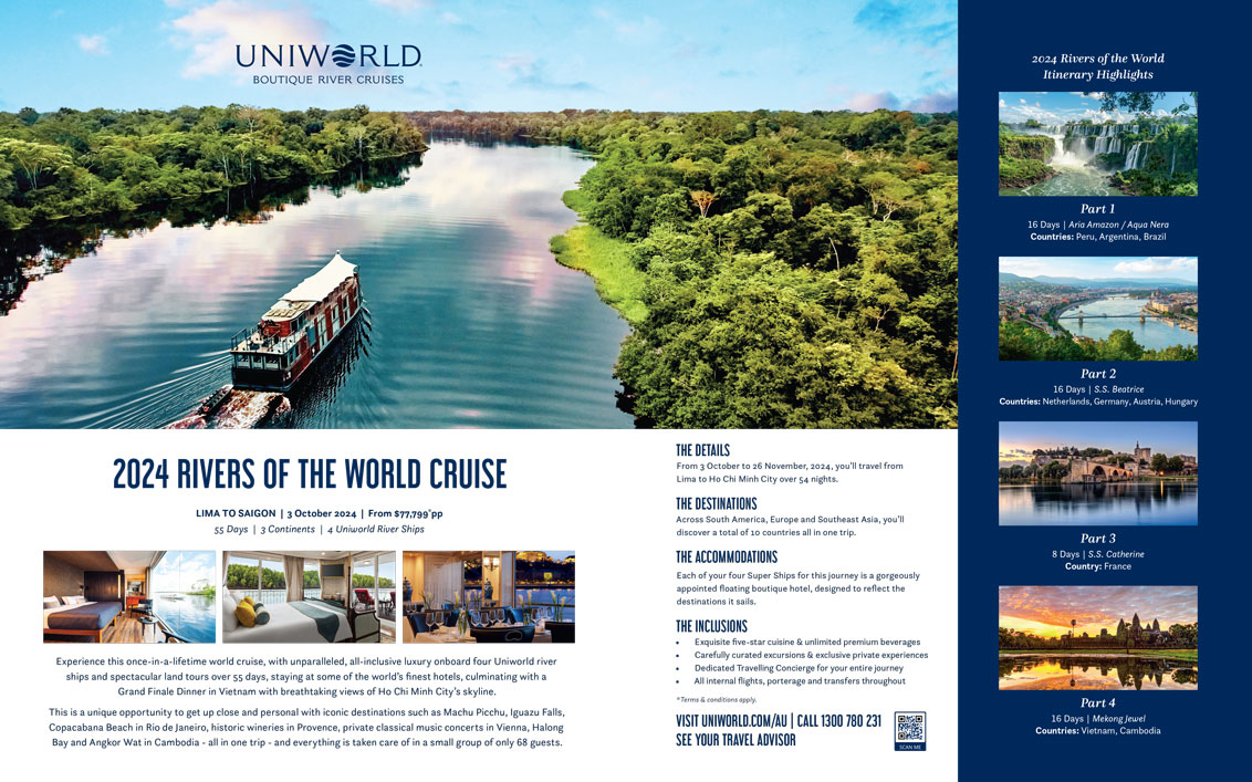 Back by popular demand, Uniworld’s second annual Rivers of the World cruise is scheduled for 2024 and is currently available for booking. The 2024 trip is even longer and even farther reaching, taking 68 guests on a 55-day itinerary spanning three continents, 10 countries and four luxurious Super Ships including new-to-Uniworld destinations, Argentina and Brazil. For the travel advisor toolkit, click here.