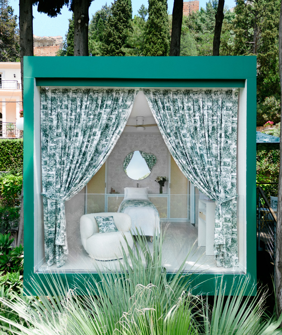 Guests are invited to climb a few steps up a wooden staircase to access two highly sophisticated treatment cabins, one double and one single, perched in the cypress trees. These vibrant green wooden treehouses are elevated with the famous Toile de Jouy curtains, in a matching shade.