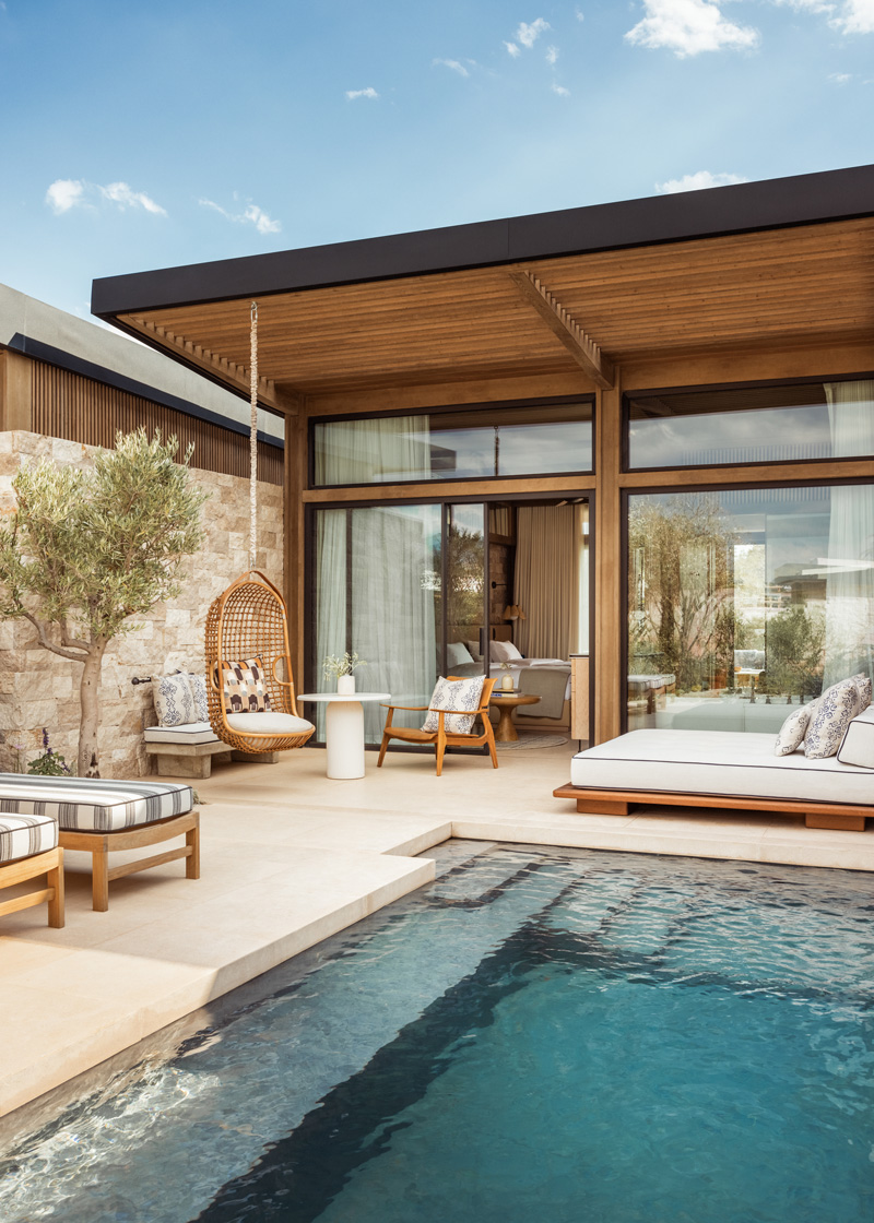 One&Only Aesthesis embodies the glamour of the Aegean with a collection of breathtaking rooms, bungalows, villas, and an exclusive community of One&Only Private Homes, all designed to frame the stunning beauty of the Grecian coastline. Bathed in sunlight, the architecture pays homage to mid-century design with high ceilings, woven leather details, muted tones, and natural accents.Offering the unparalleled peace and seclusion of an island-style retreat, the resort’s 95 bungalows, 18 residences and two iconic villas come with private pools, sunny gardens filled with fragrant Greek flora, and atmospheric outdoor showers and fireplaces.