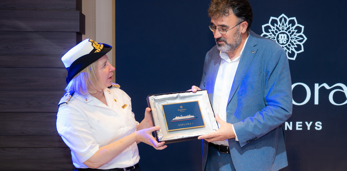 The maritime tradition of a crest exchange to celebrate a ship’s first visit to a destination took place on board between the ship’s master Captain Serena Melani and Lluís Salvadó, President of the Barcelona Port Authority. Michael Ungerer, CEO, Explora Journeys and local port officials, also attended the event.