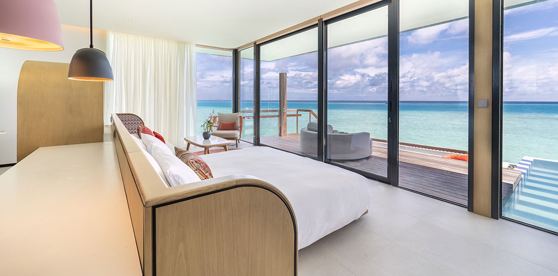 The design of SO/ Maldives is bold and structural, drawing inspiration from the craftsmanship and theatricality of contemporary couture. Upon arrival, guests are met by a spectacular, over-water pavilion, which sets the aesthetic tone of the hotel with clean lines, cool neutrals, and natural wood, juxtaposed against vibrant accentsand a sculptural, red-latticed central staircase. The hotel’s distinctive walkways are framed by billowing fabrics or architectural timber canopies, making a striking counterpart to the island’s lush natural flora, and referencing the dramatic styling of high fashion presentations.