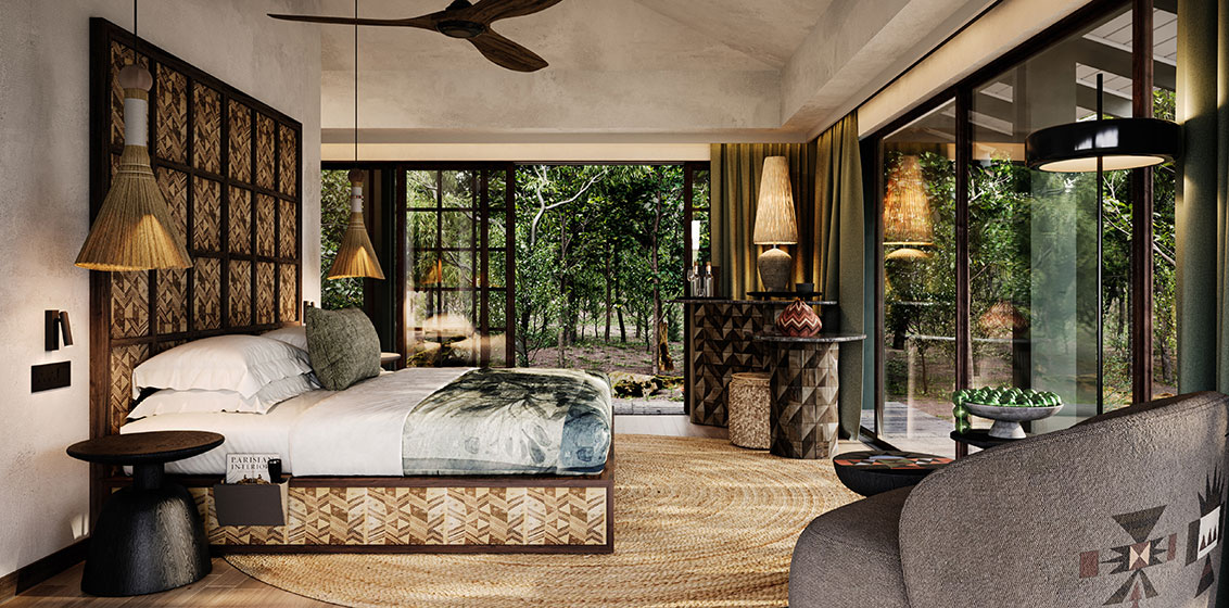 Elements of the natural forest and Zulu culture will be brought into the room through the use of tactile textures and natural materials such as woven matting, textured grasscloth wallpaper, and hardwood floors, with natural stone tiling in the bathrooms. The intention is to reconfigure the room within the existing structure, creating a more comfortable layout that better utilises the existing space, while maximising the connection to the forest through wide open views.