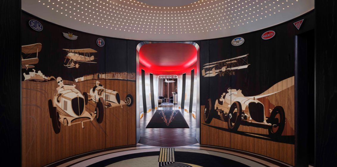 From the racetrack to the rooftop, the Brooklands journey begins on the ground floor in the dedicated lobby lined with timber and Bentley lights. The space displays a rotating collection of rare memorabilia, including the Napier Railton, the legendary aero-engined racing car, and the original Concorde nose cone.