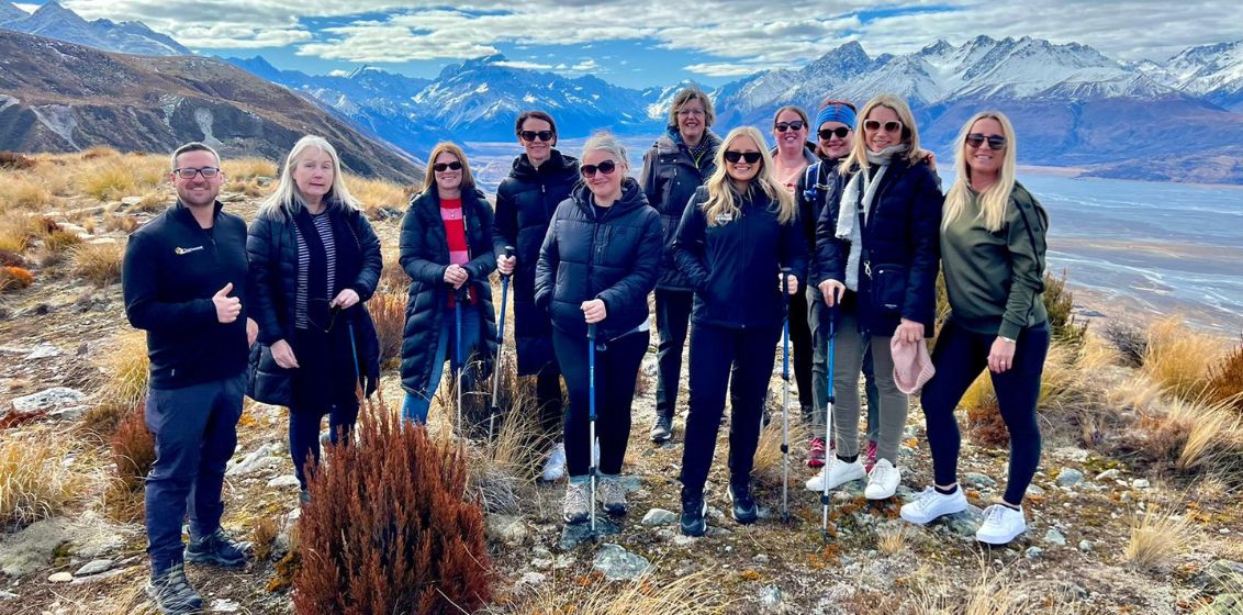 (L-R) Brian Bezalel (local guide), PTMs Dionne Smith, Sarah Knoll, Tanya Nielsen, Rachel Portelli, Carolyn Ahearne, Lexy Wildash (Tourism NZ), Jessica Bennett (PTM), Maddy (Canterbury Trails) and PTMs Jackie Sommers and Elyse Palmer.