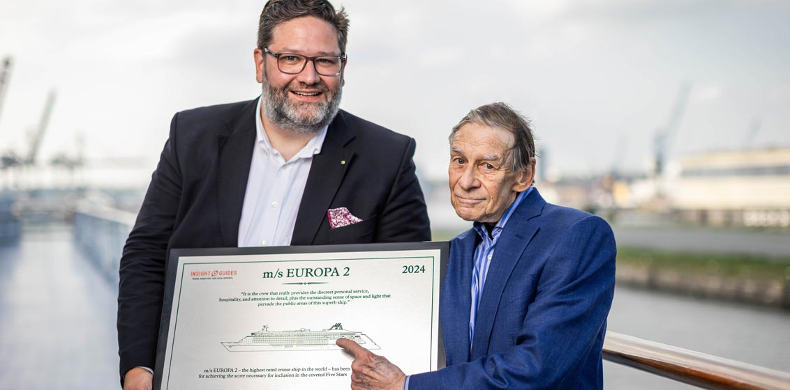 Lead image: Douglas Ward, author of the Insight Guides Cruising & Cruise Ships, congratulates Julian Pfitzner, CEO Hapag-Lloyd Cruises, © Hapag-Lloyd Cruises/Wyrwa