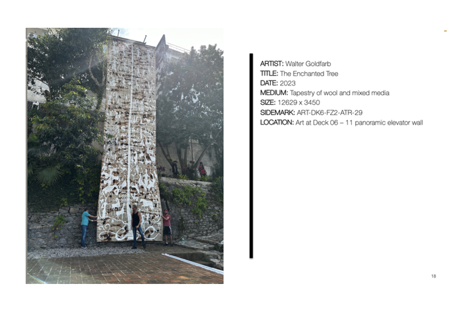 A variety of notable works will join the commissioned Fabergé Egg as centerpieces of the Seven Seas Grandeur art collection, including a staggering nearly 40-foot-tall hand-woven tapestry, “The Enchanted Tree,” created by world-renowned Brazilian artist Walter Goldfarb. The close to tapestry will hang adjacent to the elevator wall in the ship’s lavish atrium, giving multiple vantage points of this breathtaking feat of intricately woven textiles.
