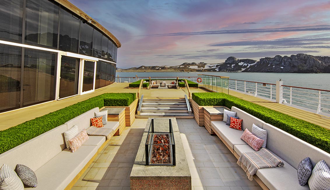 An outdoor lounge area just above sea level with recessed, heated couches and lava rock “firepits,” the Finse Terrace was designed to allow guests the comforts of the ship al fresco while enjoying the dramatic scenery. Named after the Finse Plateau in Norway, where some of the greatest polar explorers, including Nansen and Amundsen, did their expedition training in preparation for their North and South Pole expeditions.