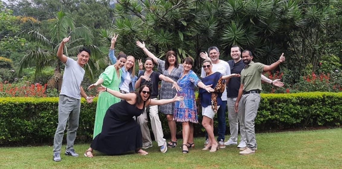 Lead image: At Tientsin Bungalow, Ceylon Tea Trails, from left are: Louis Teng, Travel Associates; Sonya Hogan, MTA; Patricia Gordon, Savenio; Sally Watson, Travel Associates; Belinda Layt, ID Travel Group; Melinda Ford, Savenio; Lisa Dosanjh, Sri Lankan Airlines; Robert Frank, Verve Creative Events; Beau O’Neill, Frontier Travel; Chandima Abeysinghe, ID Travel Group and Sandra, Di Benedetto, MTA – mobile travel advisor (in front in the black dress).