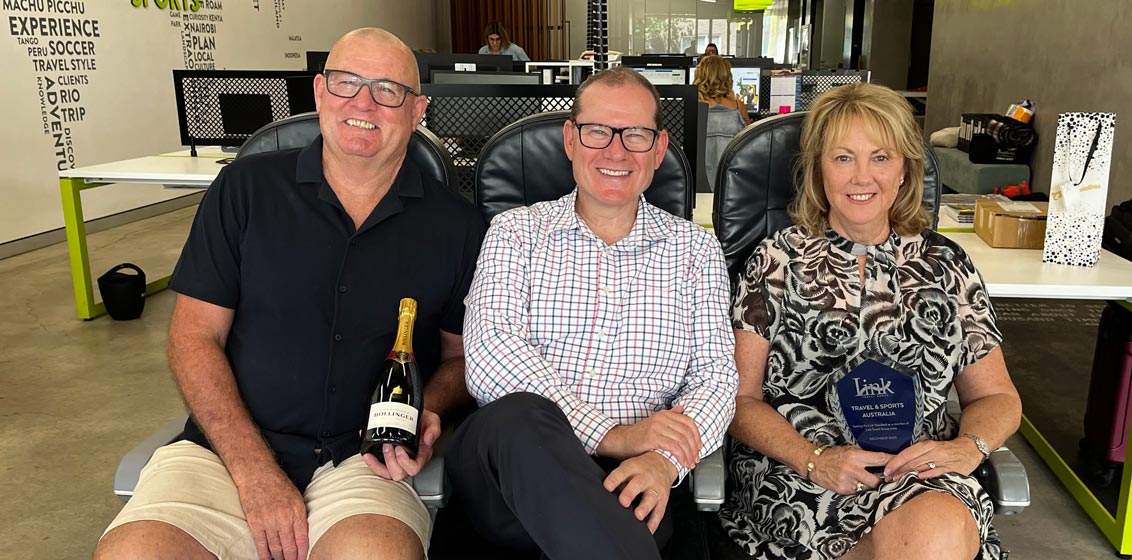 Lead image: Paul and Terrel Ramsay of Travel & Sports Australia with Scott Darlow, GM, Link Travel Group.