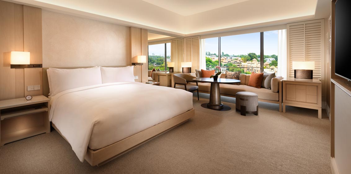 Floor-to-ceiling windows, complemented by plantation shutters, invite nature from the outdoors in. The spaces are infused with tranquillity, featuring serene hues and natural tones in sand, cream, and muted greens, and are accented by signature palm motifs and potted tropical trees. Each guestroom features prints by Singaporean artists, capturing the city’s charm through illustrations of native flora.