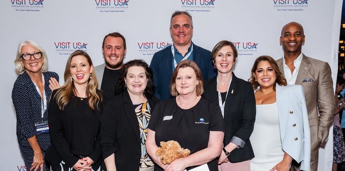 Lead image – the New York delegation, from left: Caroline Davidson, President of Visit USA Australia; Anna Riedel, New York City Tourism + Conventions; Chris Rosenow, Hudson Yards; Dawn Hopper, New York’s Backyard, Hudson Valley; Robert Turner, Arthouse Hotel NYC; prizewinner Sue Cousin, It’s All About Travel; Claire Chirouze Ulloa, Summit ONE; Alexandra Rodriguez, Hotel Beacon and Reginald Charlot, New York City Tourism + Conventions.