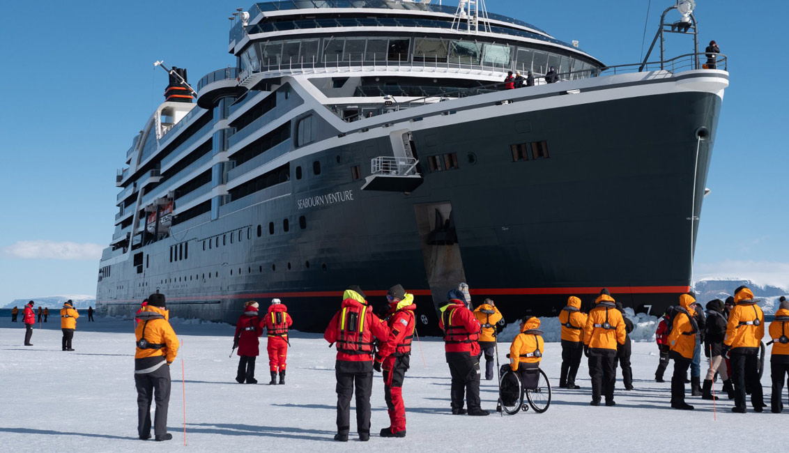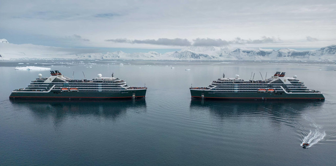 Lead image: Seabourn’s expedition sister-ships, Seabourn Venture and Seabourn Pursuit, meet bow-to-bow in Antarctica in November 2023.