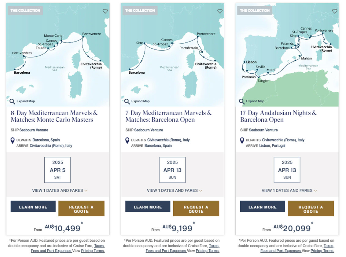 Online Seabourn lists seven itineraries in ‘The Collection’ in 2025, ranging from 7 to 18-days duration, including a 7-day Mediterranean Marvels & Matches from Rome (Civitavecchia) to Barcelona journey on 13 April; and a 10-day Andalusian Nights: Spotlight on Seville sailing from Barcelona to Lisbon on 20 April.