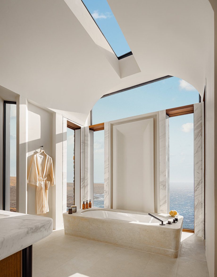The resort’s 63 cliffside villas have been arranged to maximise privacy while showcasing panoramic views over Kéa’s dramatic landscapes and the Aegean Sea.