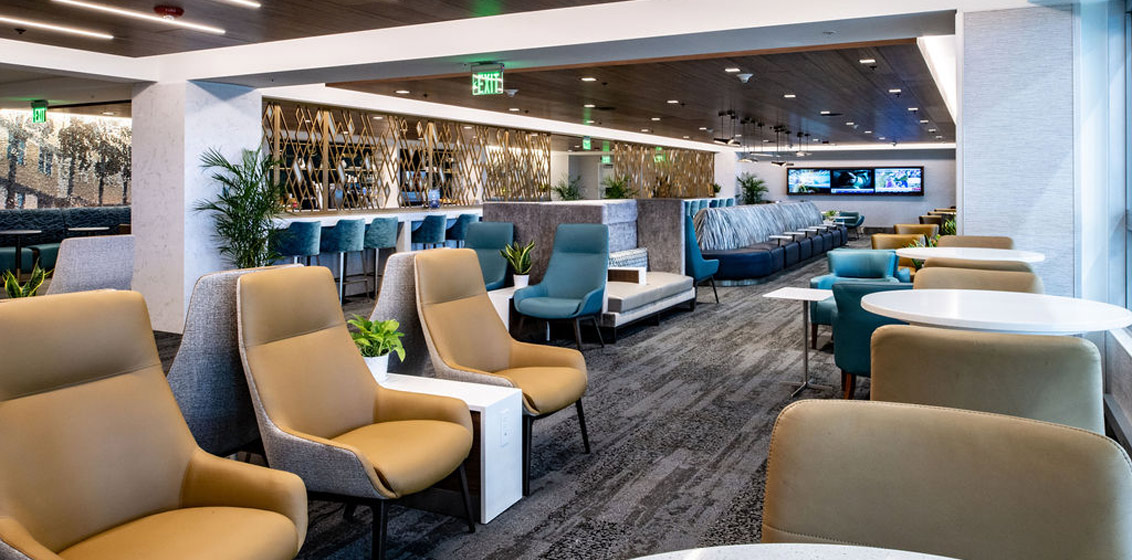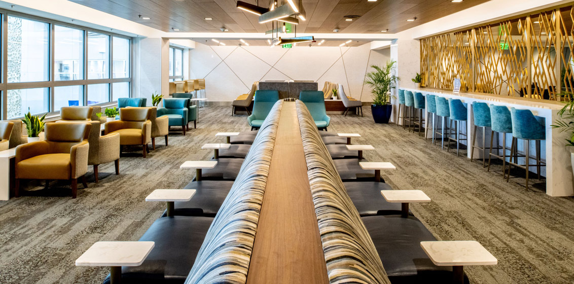 The Club expansion features a new service buffet and additional beverage station to support that higher guest volume. Seating in the expansion is tailored to the needs of the business traveler, with single-seat dining tables, a communal table with a charging source in the center, and power outlets at almost every seat. Throughout the Club, seating has been refurbished to match the elevated look of the newly added space. Guests of the renovated lounge can enjoy a view to the H Concourse below from the expansion space.