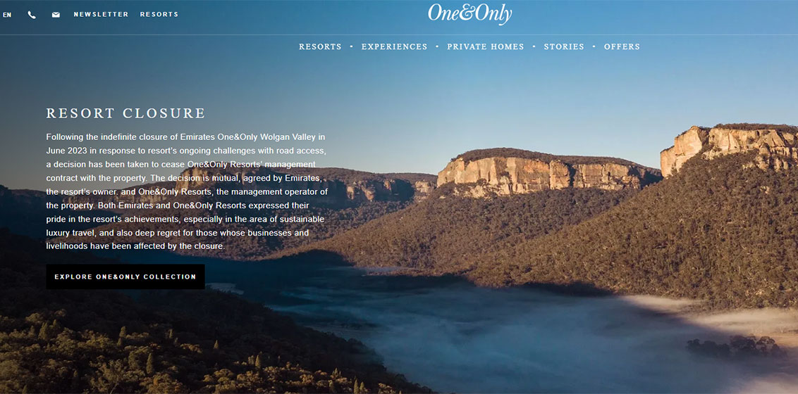 “Following the indefinite closure of Emirates One&Only Wolgan Valley in June 2023 in response to resort’s ongoing challenges with road access, a decision has been made to cease One&Only Resort’s management contract with the property.”