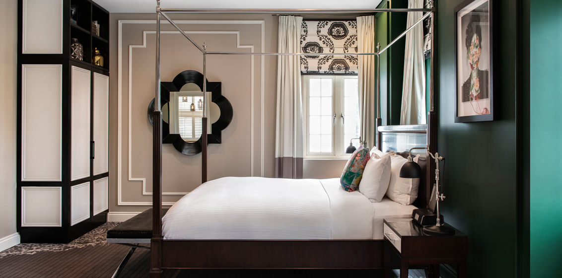 the hotel pays homage to the building’s past as a residency for physicians, including a vintage cage-styled elevator, original woodwork throughout and decorative ceilings.