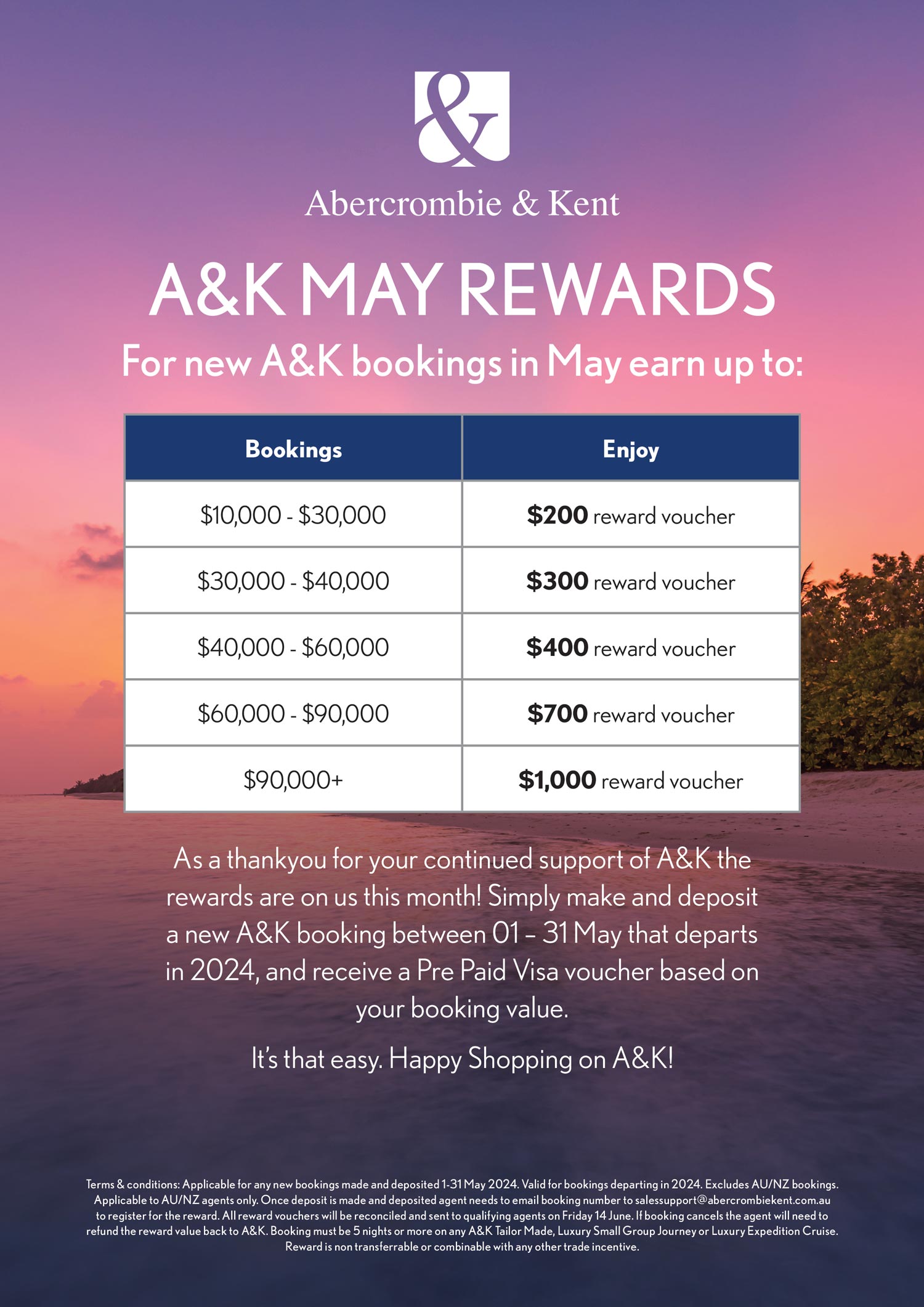 May is gearing up to be a huge month at Abercrombie & Kent with the launch of its ‘A&K May Rewards’ offer. Travel advisors who deposit on a new A&K booking between 1 – 31 May that departs in 2024 will receive a pre-paid Visa voucher based on the booking value.