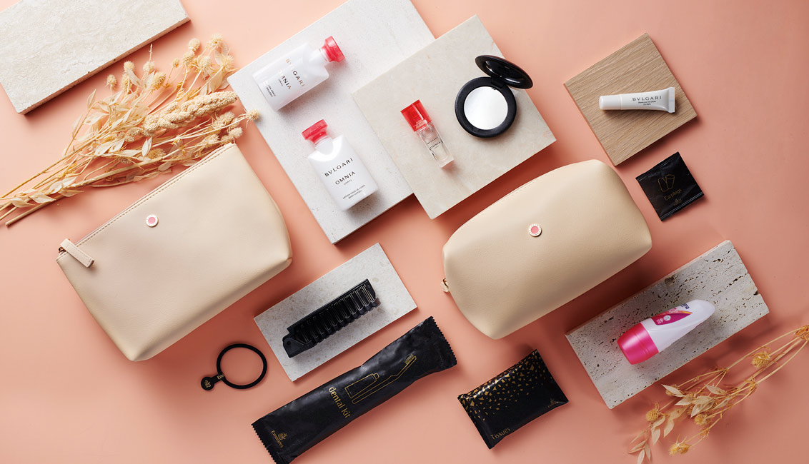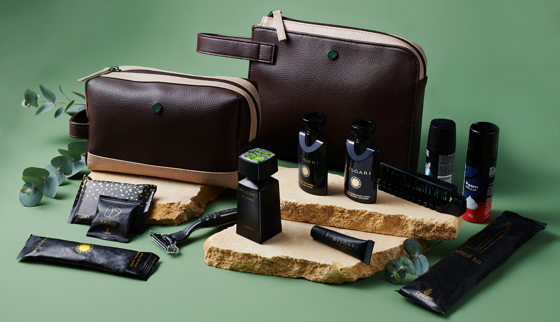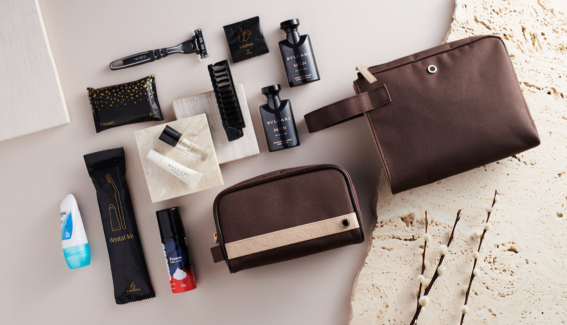 Customers will also receive a complementary Omnia Coral-scented face emulsion and body lotion, alongside a Bulgari lip balm. Other comfort essentials will be offered to customers including a dental kit, earplugs, a double mirror made from wheat straw material, a deodorant, tissues, and a foldaway hairbrush with a new soft black elastic hair tie.