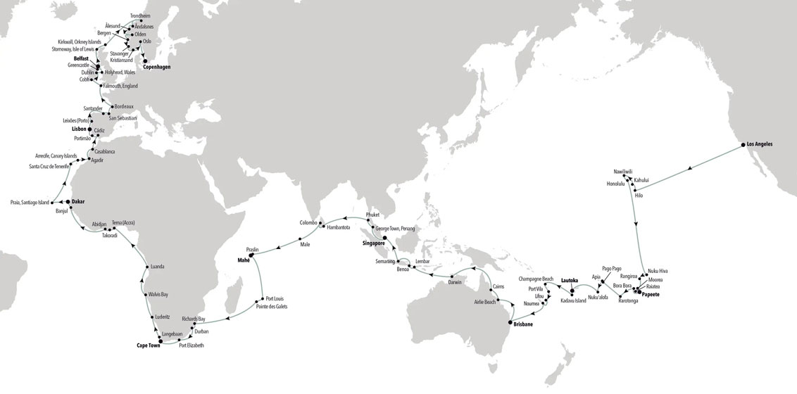 Highlights of this chapter include Bali, Semarang, Singapore, Colombo, the Maldives, Seychelles, Reunion, South Africa, and more. UNESCO-listed highlights of this segment include a visit to the Great Barrier Reef and a chance to explore the Vallée de Mai Nature Reserve on the island of Praslin, Seychelles.