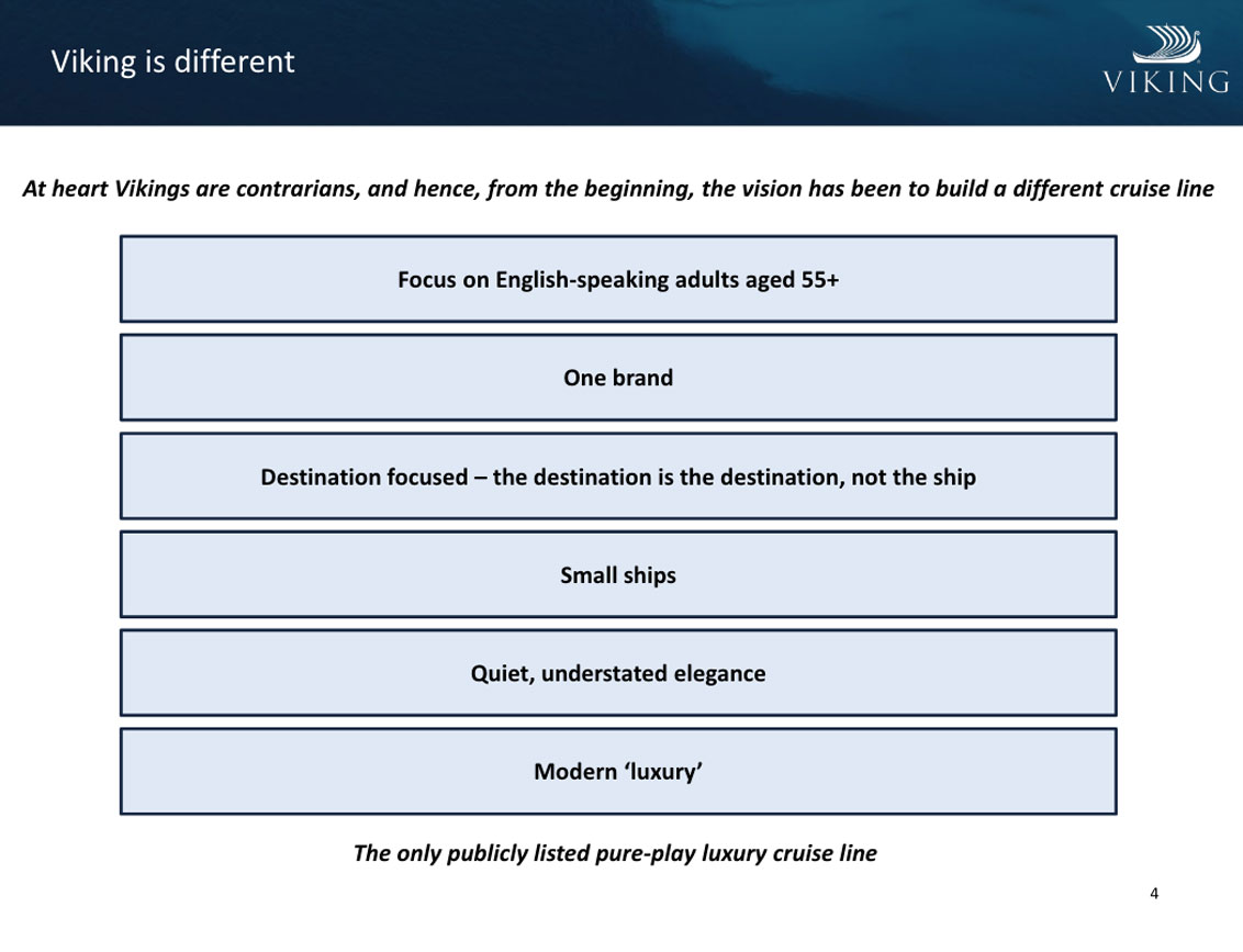 In the presentation, Viking refers to itself as “the only publicly listed pure-play luxury cruise line”. That phrase is based on the brand’s key selling points: target audience, brand, destination focus, ship size, quiet and modern ‘luxury’.