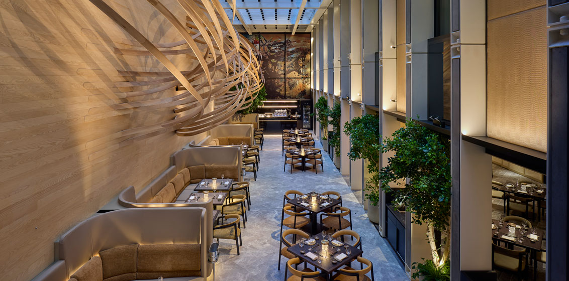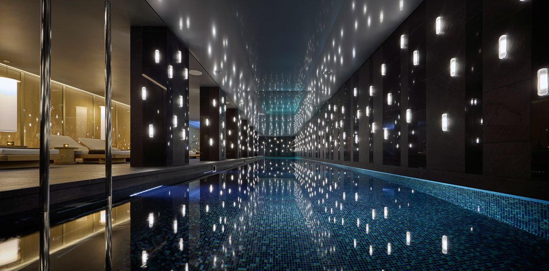 The large sculptural lobby and reception to the spa boasts rare green Ming marble to reflect the green spaces of Hanover Square, Berkeley Square and Green Park, whilst the dining spaces have been inspired by “a walk in the park” and the natural elements of ‘wind’, ‘water’, ‘earth’ and ‘fire’, reflected through carefully choreographed lighting, suspended structures and metallic ceilings.