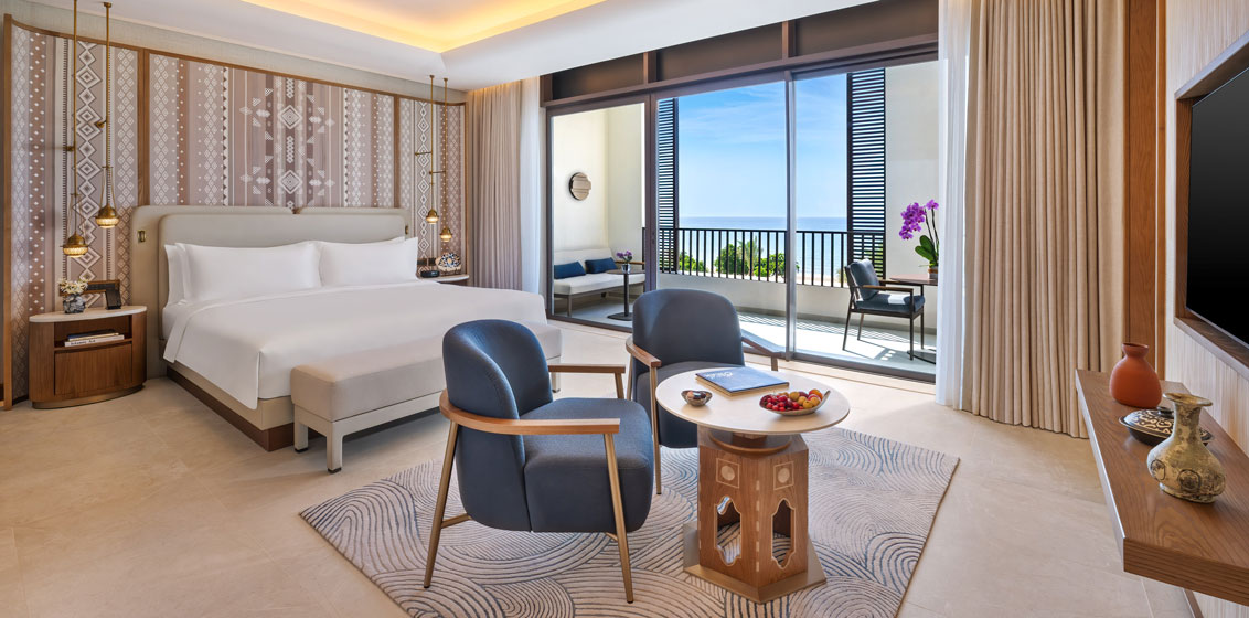 The hotel’s architecture draws inspiration from the richness and diversity of Oman’s culture, inviting guests to embark on a journey of discovery. Entering the hotel lobby through grand Omani wooden doors, guests experience a seamless blend of influences from various regions and civilisations, honouring the culture and craftsmanship of Oman.