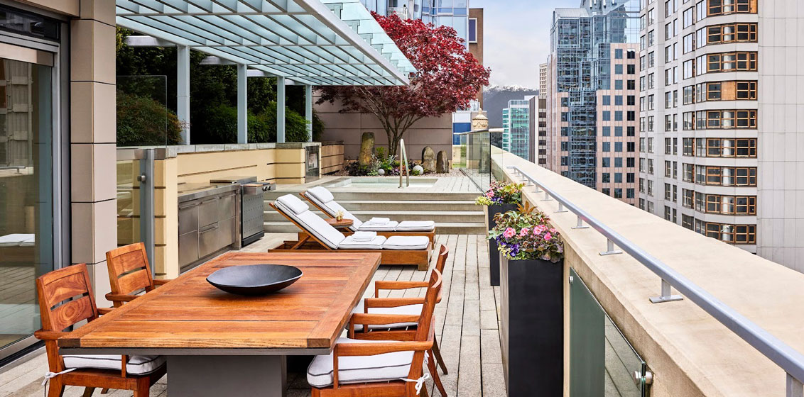 Similarly luxurious, the 1,492 square-foot (140 square-metre) Rosewood Suite, inspired by the verdant Pacific Northwest, offers two bedrooms, two baths, a spacious living area, and a rooftop garden terrace for up to 20 guests. Modern with sleek silhouettes and graphic patterns, it can connect to an additional room for a three-bedroom setup and includes a private plunge pool and fireplace with bird’s-eye views of Vancouver.