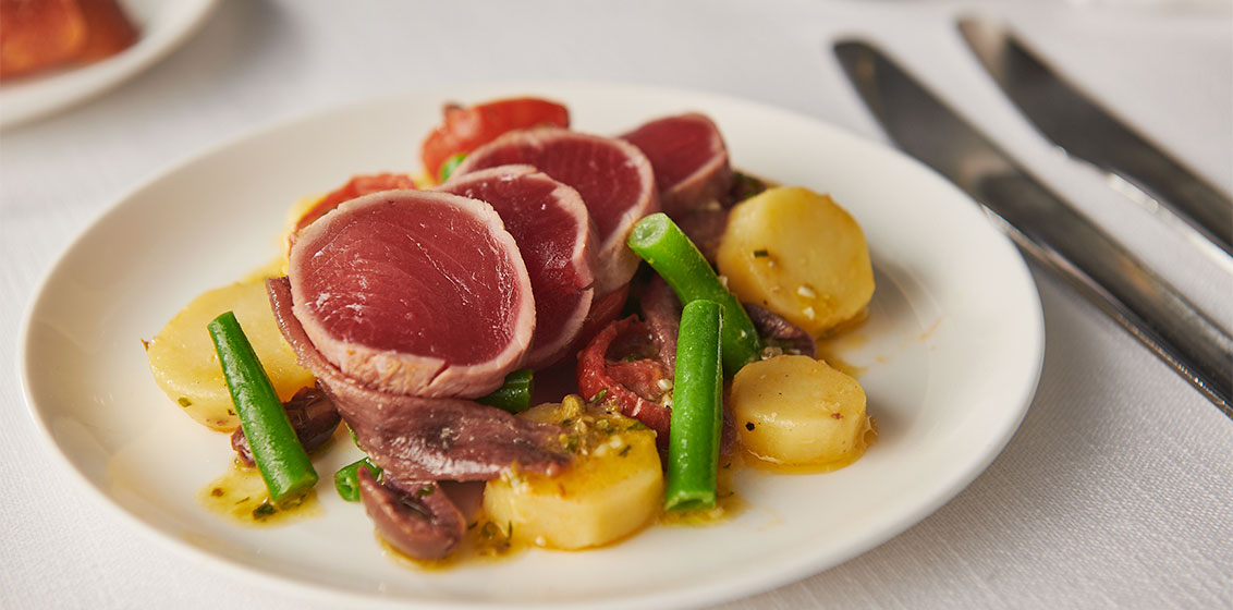 - Fresh tuna Nicoise salad with olives, green beans, and lemon dressing.