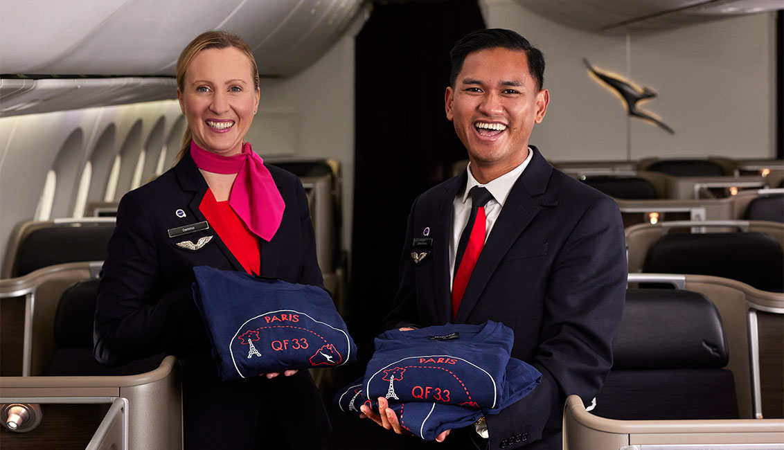 Chic limited-edition pyjamas with matching French-inspired amenity kits will be on offer for Business Class customers travelling on the new Paris route.Created by Australian designer Martin Grant, the navy pyjamas display the journey between Australia and France.