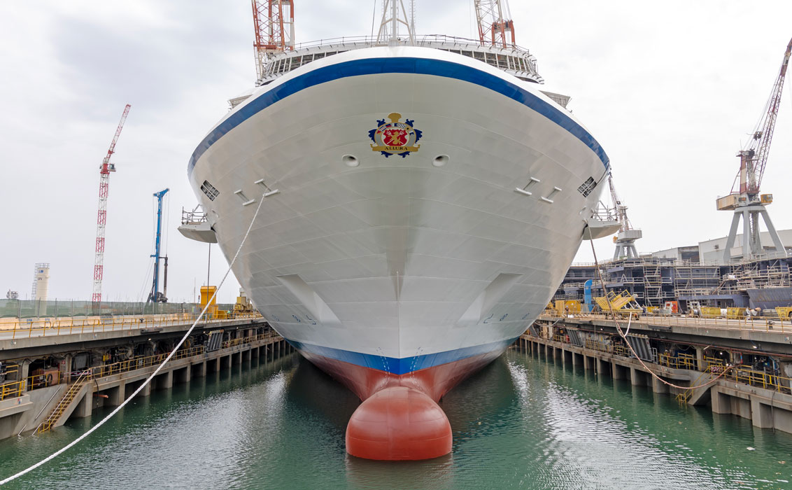 The ship was blessed by the shipyard’s chaplain, Father Stefano, in a low-key ceremony in deference to the recent passing of General Claudio Graziano, Chairman of Fincantieri. Allura’s shipyard Madrina, Caterina Romeo – a designer in Fincantieri’s technical department – christened the ship as is traditional, endowing blessings upon the vessel and all who embark upon her.