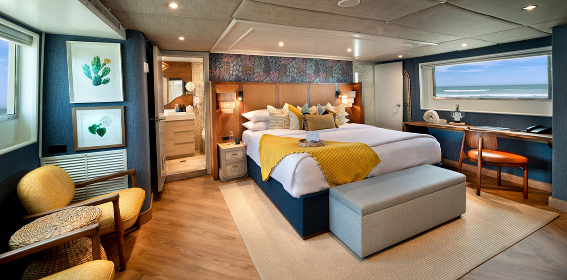 With only 12 guests on board, the elevated guest-to-staff ratio makes the Galapagos Explorer the most exclusive yacht operating in the islands. In addition to the highest level of guiding, the vessel also offers beautifully appointed spacious indoor and outdoor guest areas, as well as four exquisite cabins and two luxury suites.
