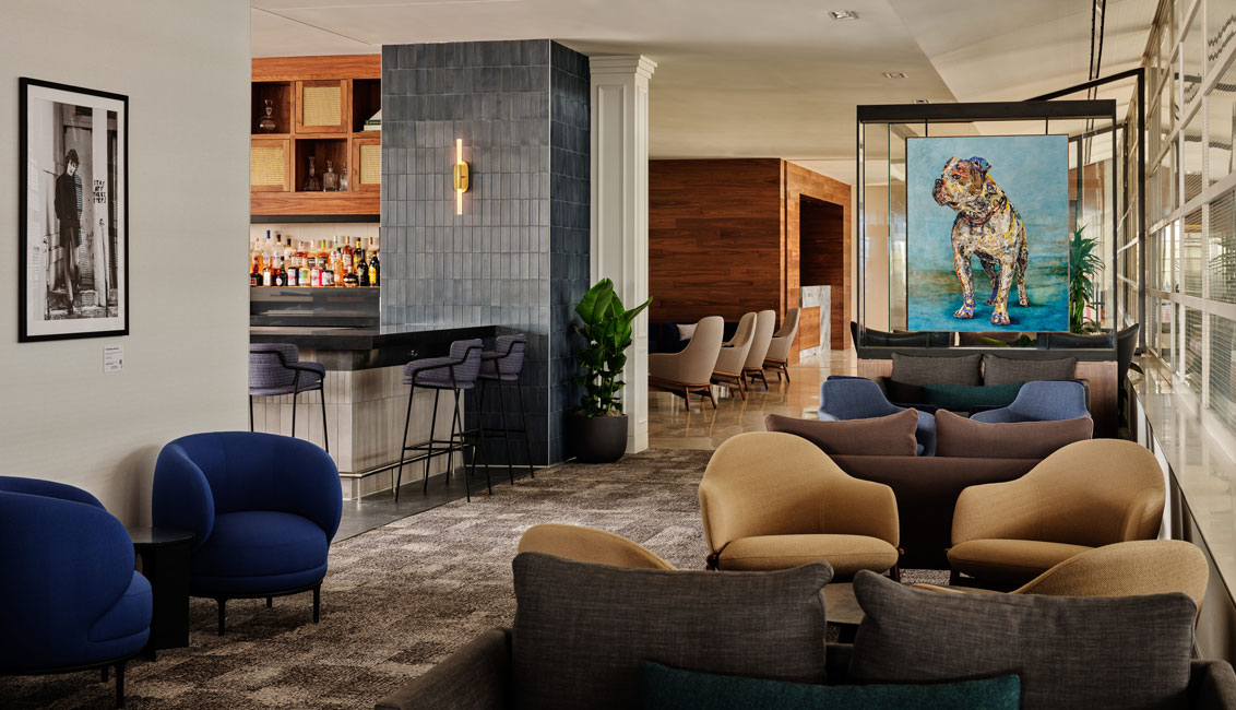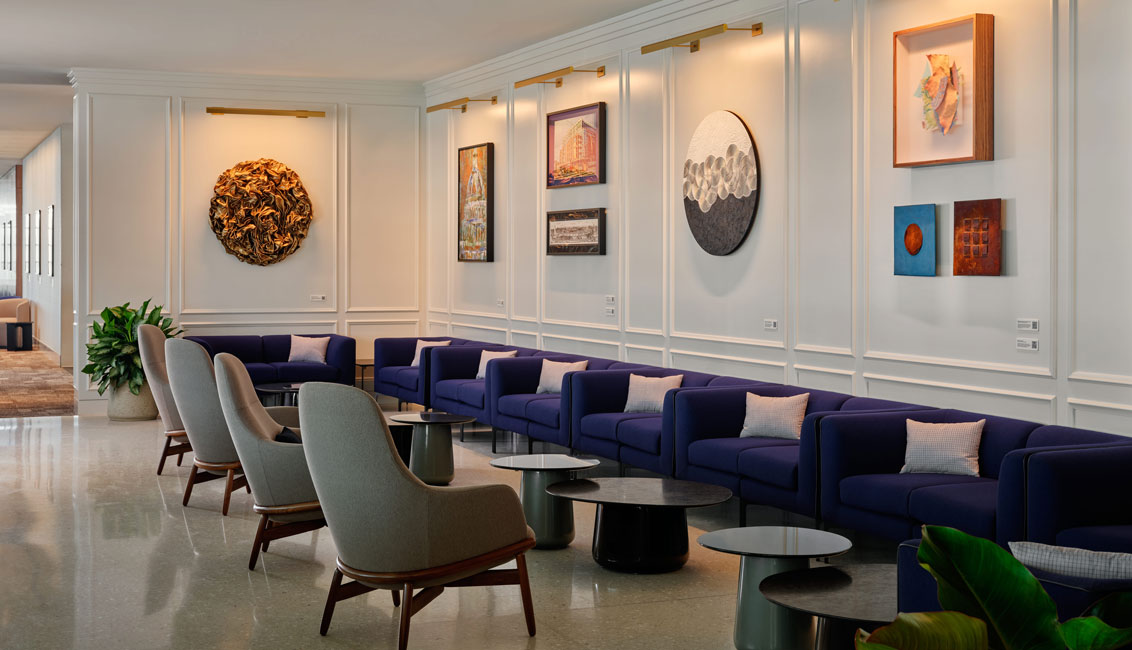 Drawing inspiration from Washington, DC’s history and rich culture, the lounge includes artwork from established and emerging local artists. The art gallery features pieces by Claudia “Aziza” Gibson-Hunter; a printed canvas of the Capitol Building by Maggie O’Neill, a native Washingtonian known for her iconic pop impressionist paintings of Washington, D.C. landmarks; a pair of mixed media tiles by Lori Katz; and an abstract work by artist Emon Surakitkoson.