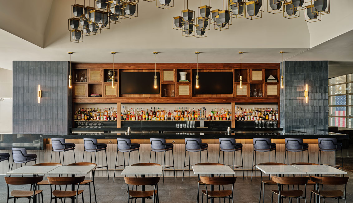 Inspired by the Potomac River, the central dining area features a stunning ceiling sculpture made up of 260 lanterns to reflect the original boundary markers used to outline the city when it was founded in 1791.