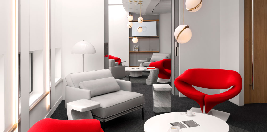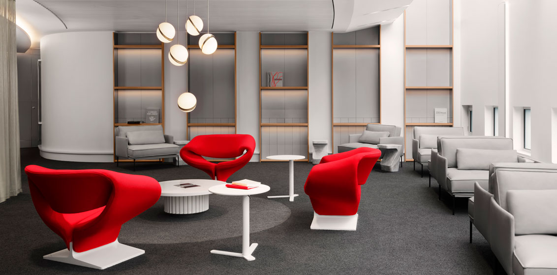 Acting as a tranquil haven amidst the bustling airport environment, this lobby embodies French elegance and sophistication. Meticulously crafted by Air France experts in collaboration with the SGK Brandimage agency, its design seamlessly combines individualised spaces while preserving an overall sense of expansiveness. Decorated in a palette of white and grey accented with touches of red, the lobby boasts abundant natural light and showcases exquisite furnishings from renowned French designers such as Pierre Paulin and Christophe Pillet. Every detail, from the precise stitching to the luxurious upholstery, exudes an aura of haute couture.