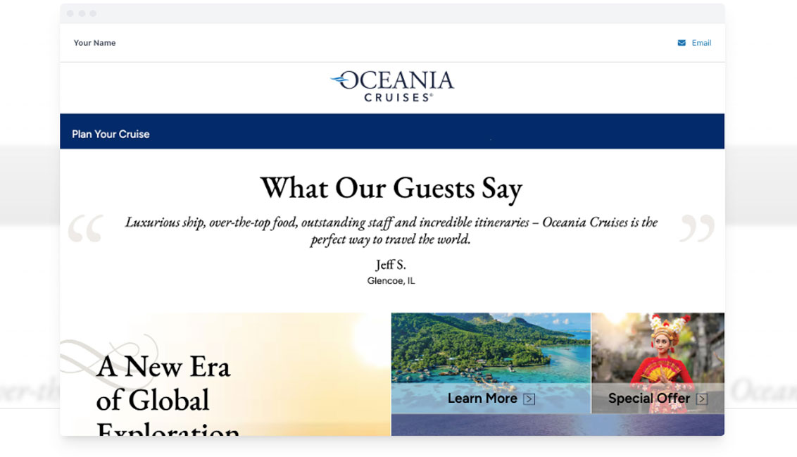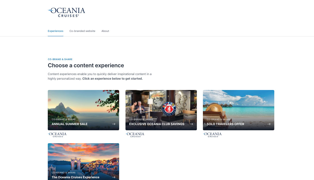 - instantly co-brandable marketing pages – to showcase Oceania Cruises’ itineraries, onboard experiences, destinations, ships and latest promotions;
