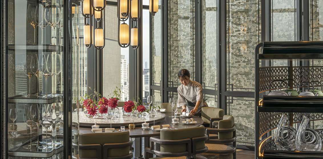 The Hotel’s signature restaurant is Jiang Nan Chun, where authentic Cantonese cuisine is presented in a striking setting that emphasizes an interactive dining experience. Here, under soaring ceilings and against glittering skyline views, guests are treated to barbecue specialties, as well as a show-stopping roast duck carved tableside. The restaurant also offers two semi-private dining rooms, plus one fully private room with its own show kitchen.