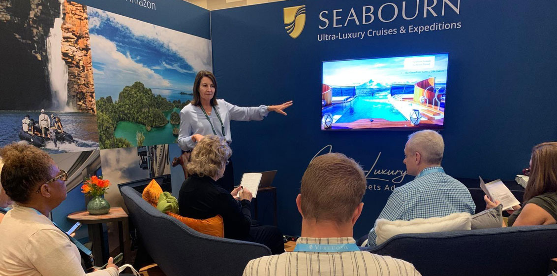 Lead image – pictured at the Seabourn stand in the Preferred Partner Lounge at Virtuoso Travel Week, from left are Neil Robertson, MTA Travel; Natalya Leahy, President of Seabourn; Jennifer Compton, Key Account Manager, Seabourn and Mark Spurway, MTA Travel.
