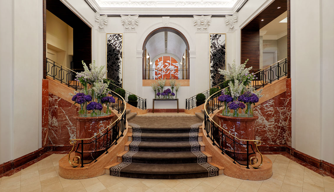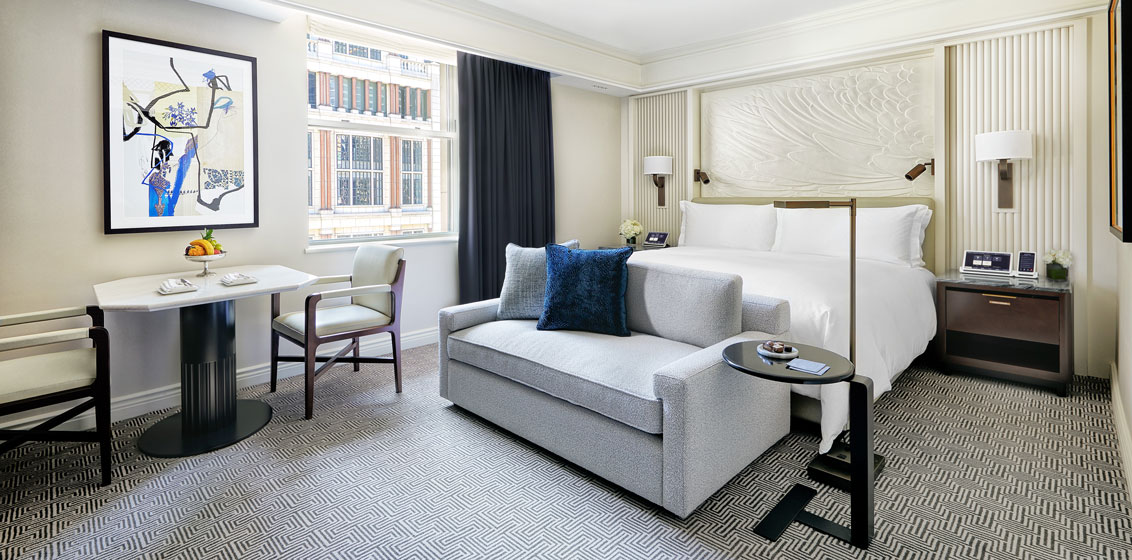 Upon arrival, guests are welcomed into The Grand Entrance with a magnificent chandelier overlooking the dramatic double-height entry Lobby with a sweeping marble double-staircase. The intimate Reception space and Concierge Desk have been redesigned with bespoke interiors of fresher, lighter finishes, accented with rich wood paneling, creating a truly welcoming guest experience. The Palm Court, the hotel’s central atrium, will feature a newly commissioned triptych by contemporary artist Ricardo Mazal – inspired by nature and representing human energy in the city -while accentuating the verticality of the voluminous space.