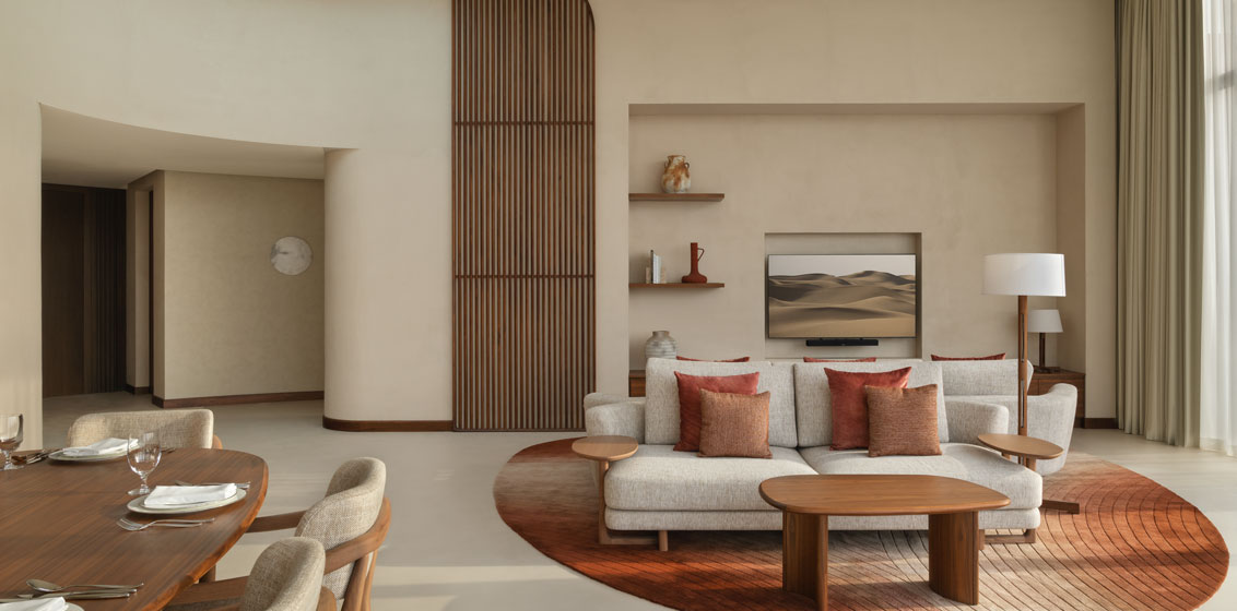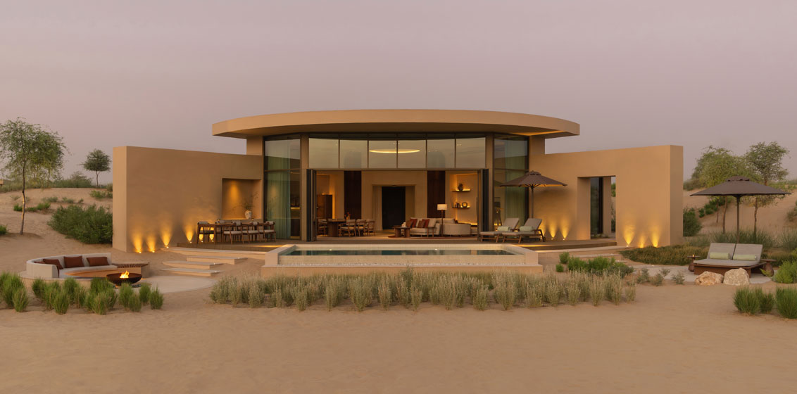 Each villa features expansive indoor and outdoor living spaces with private pools, sun loungers, outdoor fireplaces, spacious living, and dining areas. Every detail has been carefully designed to highlight the free-flowing desert landscape through expansive windows that frame the horizon and private courtyards that ensure a seamless connection to the outdoors.