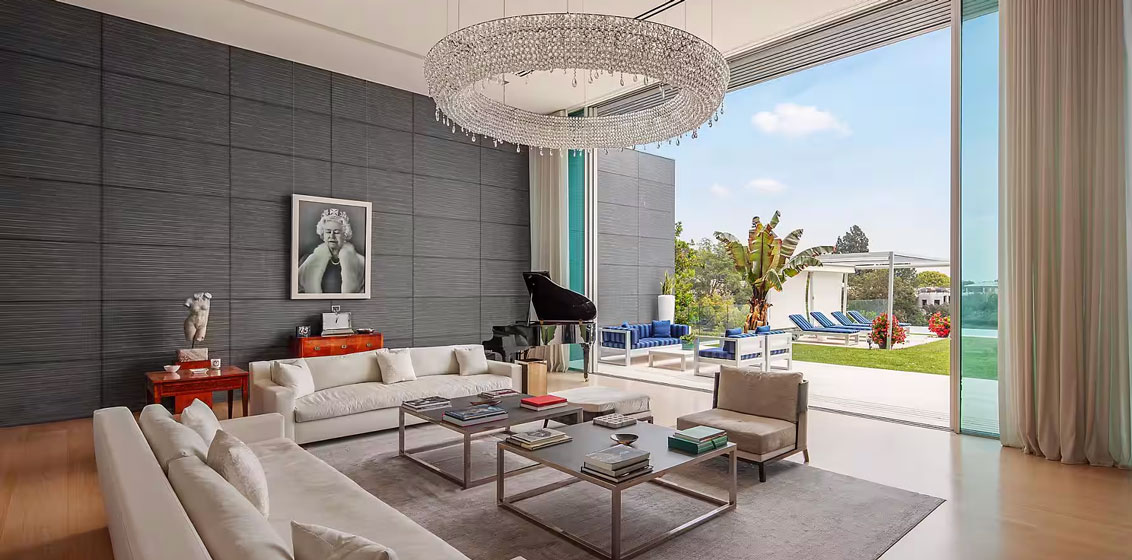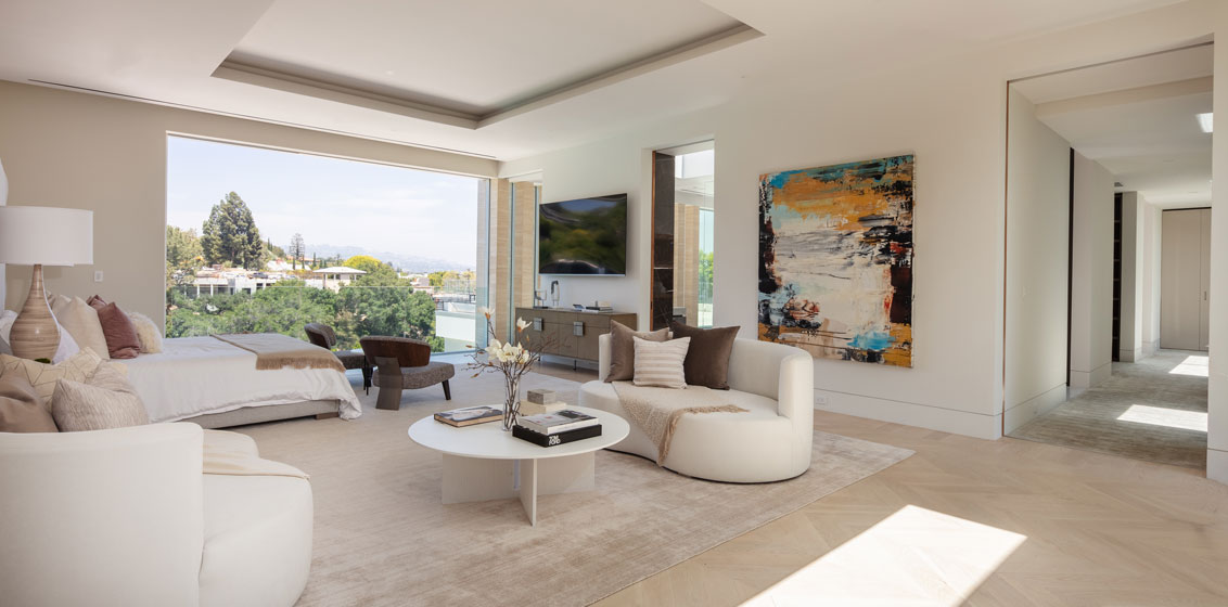 Inside, the villa boasts an airy living room, a gourmet kitchen and a media room for quiet evenings. Wellness is a central feature, with an indoor lap pool and a well-appointed gym for those seeking both fitness and relaxation. The home includes two staff suites and five en-suite guest bedrooms, each designed for comfort and privacy. The master suite, with its sweeping panoramic views, offers dual walk-in closets, a luxurious soaking tub, and an adjoining office.Villa Serenity – Bel Air, Los Angeles