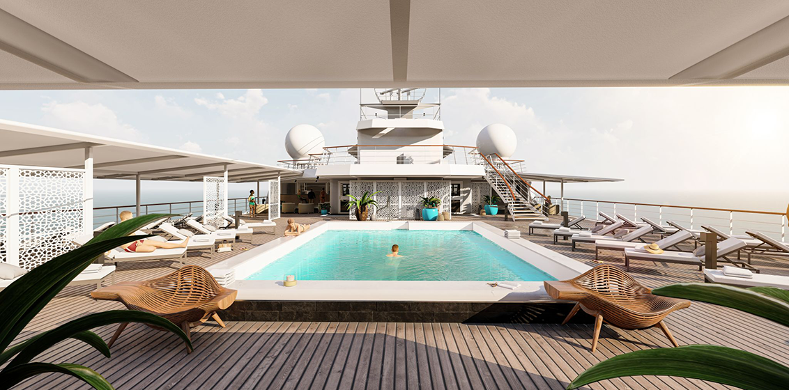 The refurbishment will feature sustainable technology enhancements to improve efficiency and reduce environmental impact. It will also include a transformation of the vessel’s Le Grill restaurant, and a rejuvenated pool deck complete with cabana-shaded areas.