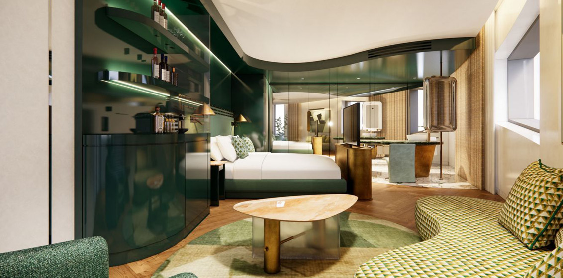 Encapsulating the hotel’s vision of both tradition and modernity, the hotel’s guestrooms, including 23 suites, feature striking colours and reflective textures, creating a refined ambiance. The E-WOW Suite on the 8th floor echoes the architecture of the new building whilst embracing Art Nouveau styles partitioning the room for guests to recharge, entertain, and work. The WOW Bohemia Duplex in the heritage building features restored beams and decorative arch windows, finished in a deep grenache colour palette.