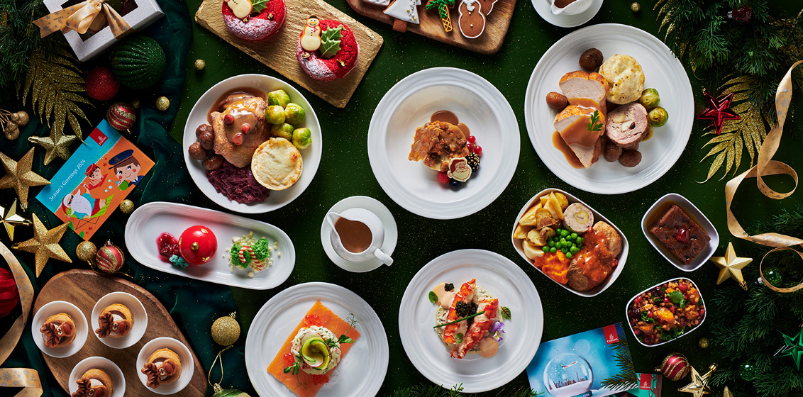 Main courses include classic turkey with jus, chestnut and turkey bacon stuffing, truffle potato gratin, caramelised chestnuts, and roasted brussels sprouts, as well as new dishes on select routes like herb-crusted lamb shank with jus, butternut squash and braised cabbage, to duck confit drizzled in cranberry jus lié, with truffle potato gratin and caramelised chestnuts, to seared venison soaked in sage butter and blackberry sauce with potato gratin and braised red cabbage with apple. An array of festive desserts awaits featuring all the flavours of the season, and First Class customers will also enjoy their very own Santa Claus, made from fresh strawberries and cream.