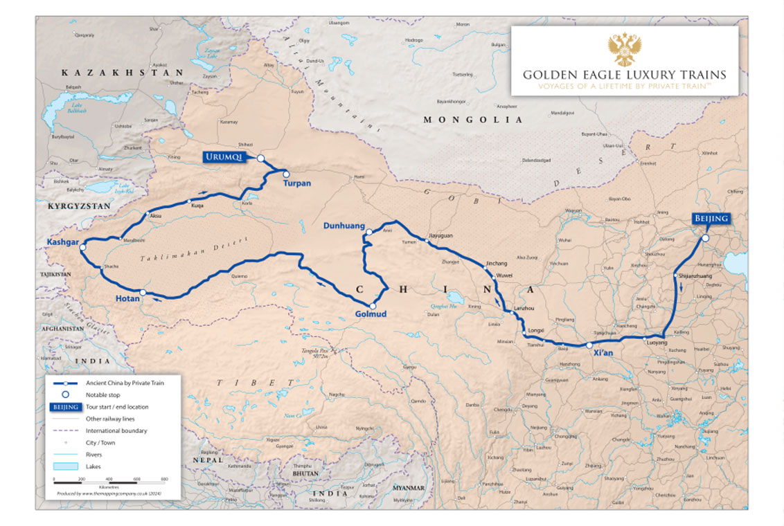 - Ancient China by Private Train, a new 12-day rail trip between Beijing and Urumqi in Northwestern China. This exclusive journey onboard the Golden Eagle Silk Road Express will encompass imperial capitals, desert oases and ancient cities, including Xi’an, Dunhuang, Hotan, Kashgar and beyond, and attractions including the Terracotta Warriors, the Great Wall and Apak Khoja Tomb in Xinjiang.