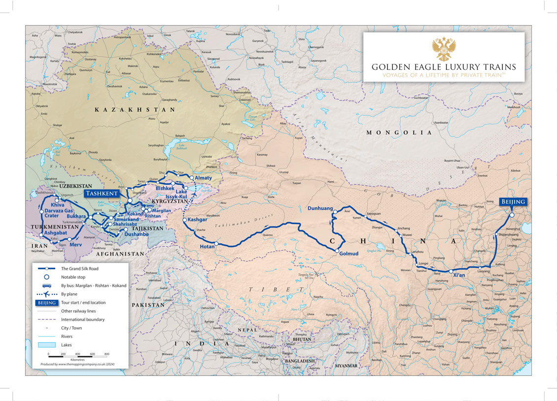 - The Grand Silk Road, a 22-day journey between Beijing and Tashkent aboard two private trains – six nights on the Golden Eagle Silk Road Express and 12 nights on the Golden Eagle, with two night pre-tour in Beijing and one night at Ritz-Carlton Almaty. Destinations visited include Xi’an, Dunhuang, Kashgar, Samarkand, the Gobi Desert and UNESCO-listed sites. The route was last operated in 2019, with 2026 marking the return of the legendary Silk Road.